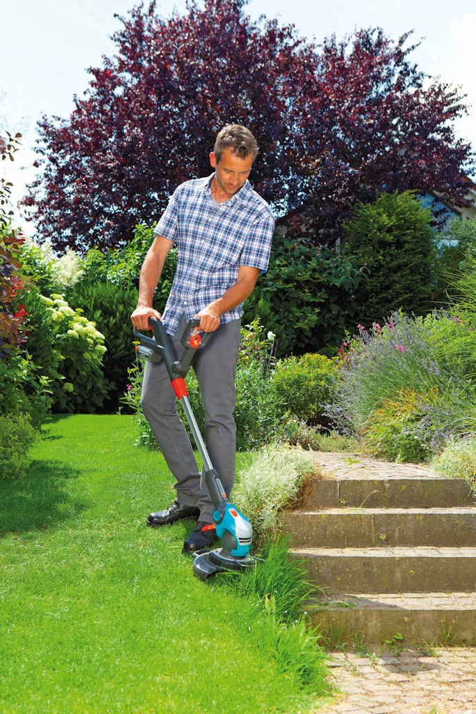 De lichtgewicht GARDENA Accu Trimmer ComfortCut Li-18/23R, die zeer eenvoudig te bedienen is, is vooral geschikt voor het trimmen van lange graskanten en moeilijk bereikbare plaatsen. De verwisselbare Lithium-Ion accu is bijzonder krachtig en levert sterke en langdurige snijprestaties. Het gebruikte RotorCut System zorgt voor nauwkeurige snijresultaten bij een bijzonder laag geluidsniveau. De extra lange en eenvoudig verstelbare extra handgreep zorgt voor een comfortabele en ergonomisch geoptimaliseerde werkhouding. De telescopische steel kan worden aangepast aan uw lichaamslengte voor meer comfort bij het werken. Overhangende grasranden kunnen eenvoudig worden afgesneden dankzij de 90° kantelbare snijkop. Het geïntegreerde geleidewiel zorgt voor comfortabel werken. De schuin te verstellen steel maakt het werken op moeilijk toegankelijke plaatsen gemakkelijker, bijvoorbeeld onder een trampoline of een tuinbankje. Bij het trimmen dicht langs borders en bloemperken, kan de plantbeschermbeugel worden uitgeklapt om uw planten te beschermen. Dankzij de veiligheidsschakelaar, is de Accu Trimmer beschermd tegen onbedoeld inschakelen. De trimmer is volledig uitgerust met een accu -pack, een acculader, een magazijn voor reservemessen en 20 reservemesjes. Er is geen gereedschap nodig voor de eerste montage. De snijdiameter bedraagt 230 mm. Met een vermogen van 18 V / 2,0 Ah van de Lithium-Ion accu, kan een bedrijfstijd van maximaal 50 minuten worden bereikt. Dit is voldoende voor ca. 1250 m graskant. De POWERinfo laadstatus indicator op de accu geeft aan wanneer deze moet worden opgeladen. Een lege batterij kan volledig worden opgeladen binnen ca. 3 uur.