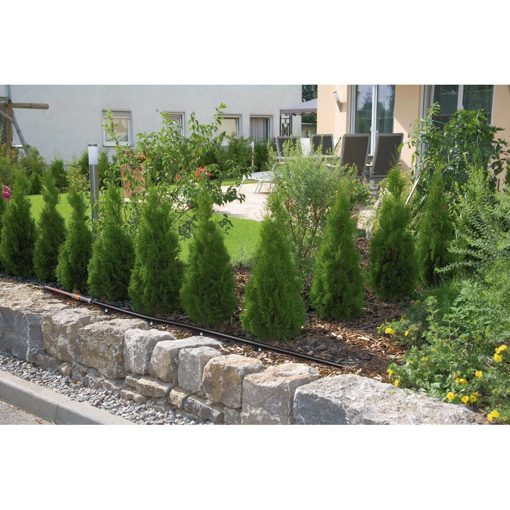 De GARDENA Bovengrondse druppelbuis met een diameter van 13 mm (1/2″) is de praktische besproeiingsoplossing voor bijvoorbeeld heggen. De ruimte tussen de druppelaars in de buis is 30 cm en elke sproeikop geeft 4 l/u. Dankzij de innovatieve labyrinttechnologie zijn de druppelaars zelfreinigend. Met een hoofdapparaat in het midden kan de buis worden verlengd met de verlengset, art. nr. 1386; de maximale lengte is 100 m. De druppelbuis wordt klaar voor aansluiting op het hoofdapparaat 1000 met doppen geleverd en heeft een lengte van 50 m.