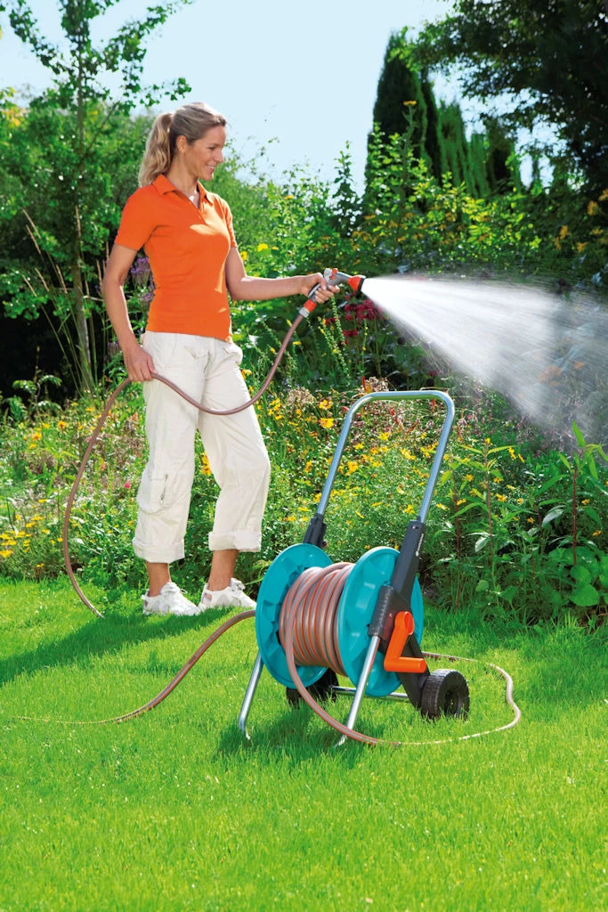 Lichtgewicht slangenwagen met 20 meter Classic 13 mm slang en pistoolbroes. Ideaal om snel uw hogedrukreiniger aan te sluiten op de waterkraan.