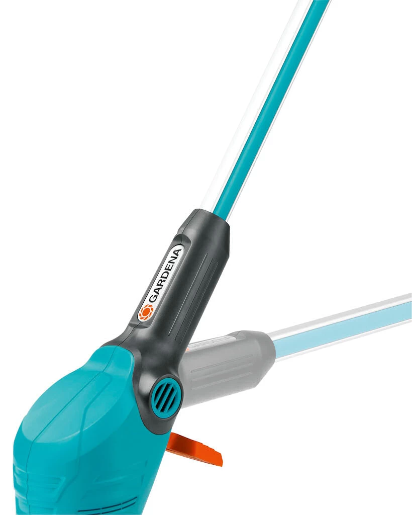 Lichte, handige trimmer voor langere graskanten en moeilijk toegankelijke plaatsen. Veiligheidsschakelaar beschermt tegen onbedoeld inschakelen. Extra grote inschakelknop voor moeiteloze bediening. Extra lange, 2e handgreep, instelbaar, voor comfortabel en veilig werken. Kabeltrekontlasting voor extra kabelhouvast. Draaibare greep voor het trimmen van overhangende graskanten. Telescoopsteel (90 tot 120 cm) voor aanpassing aan lichaamslengte. Eenvoudig werken op moeilijk bereikbare plaatsen door schuin te verstellen steel. Opklapbare plantbeschermbeugel. Gecontroleerde draadverlenging via tip-automatiek. Met draadvangbox voor extra veiligheid. Spoel eenvoudig te verwisselen. Afdekkap zonder gereedschap te monteren.