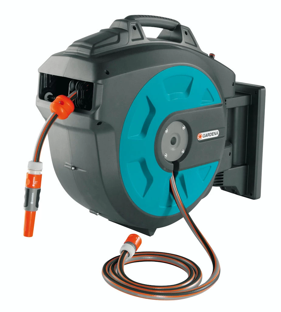 De GARDENA Comfort wandslangenbox 25 roll-up automatic maakt besproeien bijzonder eenvoudig en comfortabel. De slang wordt automatisch opgerold. De praktische slangenbox wordt aan de muur bevestigd en is 180 ° zwenkbaar. De slang kan met weinig inspanning worden uitgetrokken en gestopt met korte tussenpozen van maximaal 50 cm. De kwaliteitsslang van 13 mm (½”) levert een hoge waterdoorstroom en optimale werking van de sproeier. Met een korte ruk aan de slang, wordt de vergrendeling opgeheven en wordt de slang door de roll-up automatisch de box ingetrokken zonder dat u hier verder iets voor hoeft te doen. Uw handen blijven schoon. Een geïntegreerde stalen veer perfect op de slanglengte afgestemd, zorgt voor een krachtige, gelijkmatige slangretractie. De geïntegreerde slanggeleider voorkomt verdraaien en verstrengeling van de slang. Na gebruik kan de aansluitslang eenvoudig op de druppelstop bevestigd worden om weglopen van water te voorkomen. Broezen, sproeiers en wasborstels kunnen worden opgehangen aan de wandhouder zodat ze altijd onder handbereik zijn. Voor de winter kan de slangenbox eenvoudig met de ergonomisch gevormde handgreep van de houder afgehaald worden voor opslag in een vorstvrije ruimte. De wandslangenbox is compleet uitgerust met een 25-meter lange kwaliteitsslang, een 2 meter lange aansluitslang, een traploos verstelbare tuinspuit (art. nr. 8114) en de benodigde Original GARDENA System onderdelen: drie slangstukken (art.nr. 900, 901, 902), een standaard slangkoppeling (art. nr. 915) en een waterstop (art.nr. 913). Dankzij de meegeleverde wandhouder, samen met schroeven en pluggen, is de montage een fluitje van een cent. Besproeien is heel eenvoudig – met de Comfort wandslangenbox 25 roll-up automatisch.