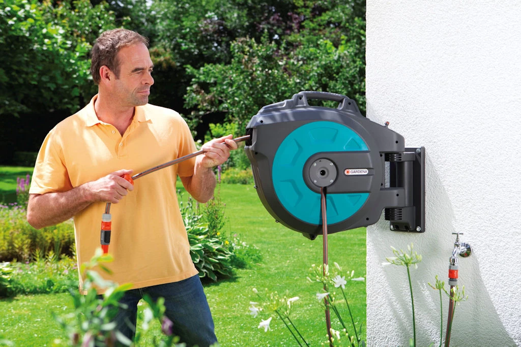 De GARDENA Comfort wandslangenbox 35 roll-up automatic maakt besproeien bijzonder eenvoudig en comfortabel. De slang wordt automatisch opgerold. De praktische slangenbox wordt aan de muur bevestigd en is 180 ° zwenkbaar. De slang kan met weinig inspanning worden uitgetrokken en gestopt met korte tussenpozen van maximaal 50 cm. De kwaliteitsslang van 13 mm (½”) levert een hoge waterdoorstroom en optimale werking van de sproeier. Met een korte ruk aan de slang, wordt de vergrendeling opgeheven en wordt de slang door de roll-up automatisch de box ingetrokken zonder dat u hier verder iets voor hoeft te doen. Uw handen blijven schoon. Een geïntegreerde stalen veer perfect op de slanglengte afgestemd, zorgt voor een krachtige, gelijkmatige slangretractie. De geïntegreerde slanggeleider voorkomt verdraaien en verstrengeling van de slang. Na gebruik kan de aansluitslang eenvoudig op de druppelstop bevestigd worden om weglopen van water te voorkomen. Broezen, sproeiers en wasborstels kunnen worden opgehangen aan de wandhouder zodat ze altijd onder handbereik zijn. Voor de winter kan de slangenbox eenvoudig met de ergonomisch gevormde handgreep van de houder afgehaald worden voor opslag in een vorstvrije ruimte. De wandslangenbox is compleet uitgerust met een 35-meter lange kwaliteitsslang, een 2 meter lange aansluitslang, een traploos verstelbare tuinspuit (art. nr. 8114) en de benodigde Original GARDENA System onderdelen: drie slangstukken (art.nr. 900, 901, 902), een standaard slangkoppeling (art. nr. 915) en een waterstop (art.nr. 913). Dankzij de meegeleverde wandhouder, samen met schroeven en pluggen, is de montage een fluitje van een cent. Besproeien is heel eenvoudig – met de Comfort wandslangenbox 35 roll-up automatisch.