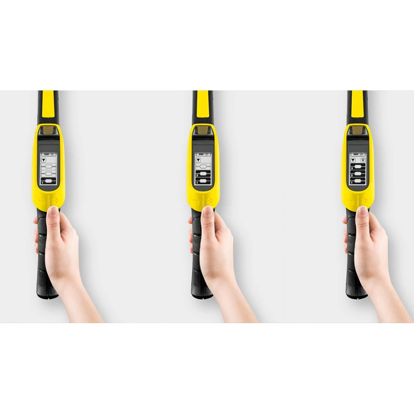 Met de K5 Premium Full Control Plus met een oprolbare hogedrukslang op de slanghaspel. Met de Full Control kan het straaltype ingesteld worden door te draaien aan de 3-in-1 Multi Jet spuitlans. De ingestelde druk kan worden gecontroleerd op de LCD-scherm van het hogedrukpistool en worden aangepast met de +/– knoppen. U hebt alles in de hand. Dit betekent dat u niet hoeft te wisselen van spuitlans, ook niet als u van hoge druk overgaat naar reinigingsmiddelmodus. Bij korte pauzes in het reinigen zet u het hogedrukpistool en de spuitlans gewoon weg.