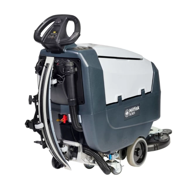 De Nilfisk SC401 schrobzuigmachine is beschikbaar in een batterij en een kabel uitvoering. De SC401 B is een batterij uitvoering. De batterij versie is voorzien van aandrijving om de ergonomie en het comfort van de gebruiker zo veel mogelijk te ondersteunen.