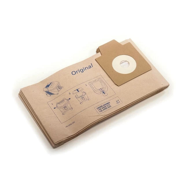 Papieren set stofzakken. De stofzakken worden in het reservoir geplaatst door de aansluiting van de stofzak over de aansluiting van de ketel te schuiven.